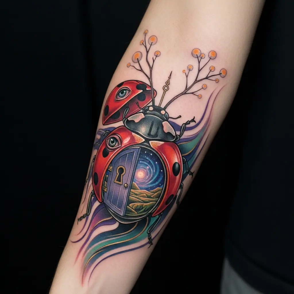Surrealist ladybug tattoos take you into the world of dreams. They combine ladybugs with surreal landscapes and creatures. These tattoos are visually striking and thought-provoking.