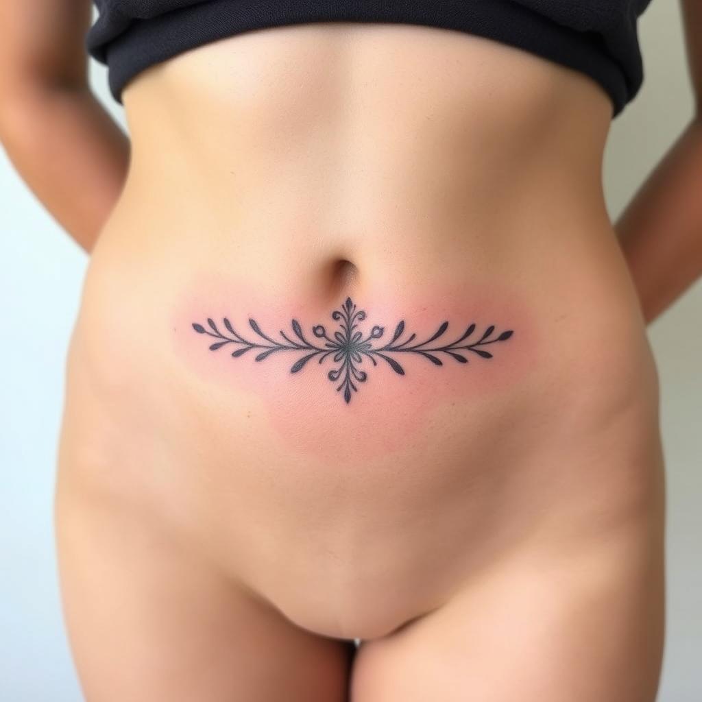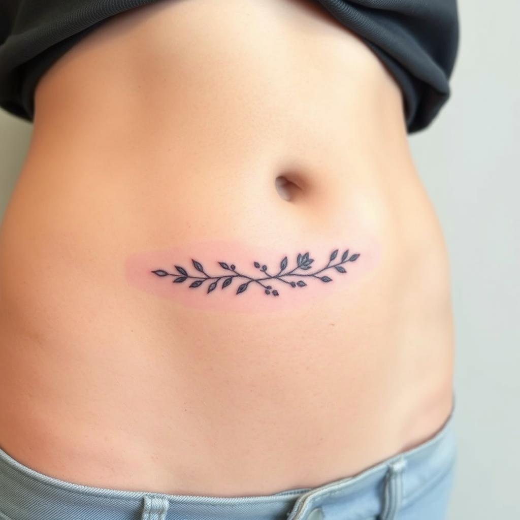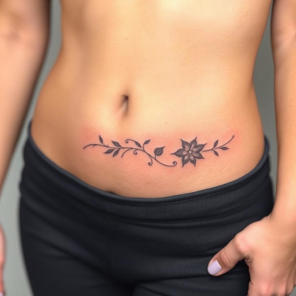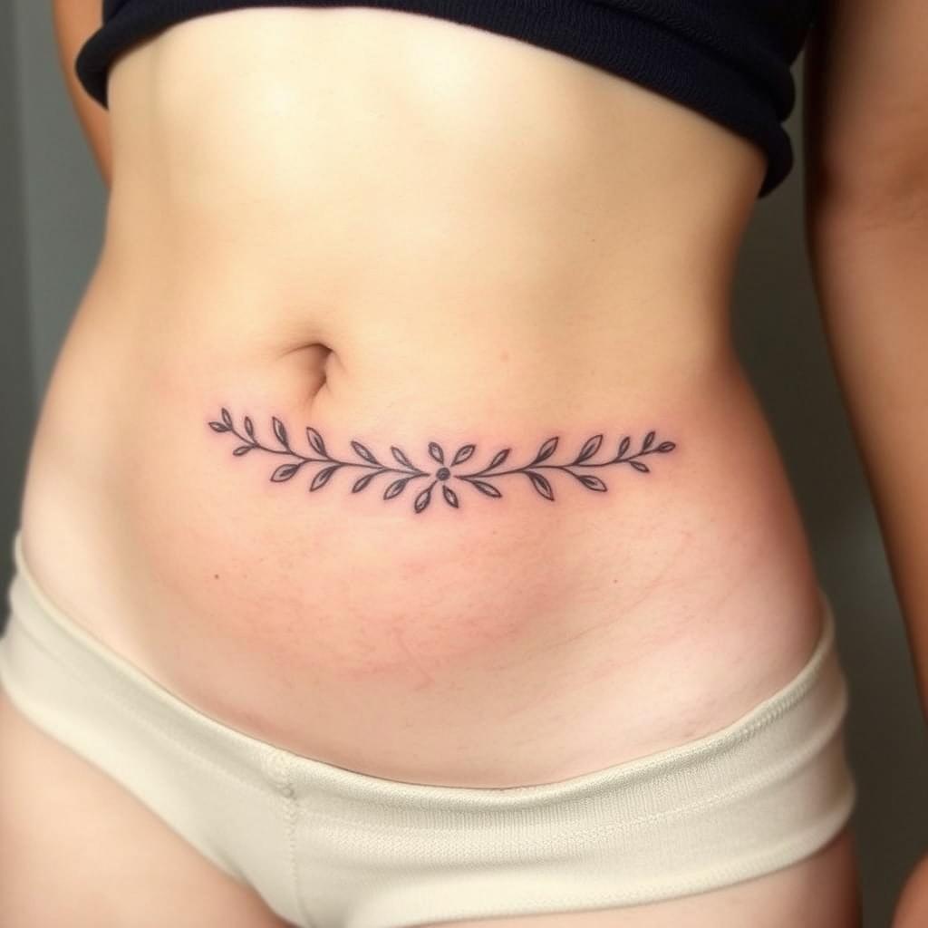 Floral or black-and-white tattoos are popular for lower abdominal scars. Try temporary tattoos to see what you like before getting a permanent one.