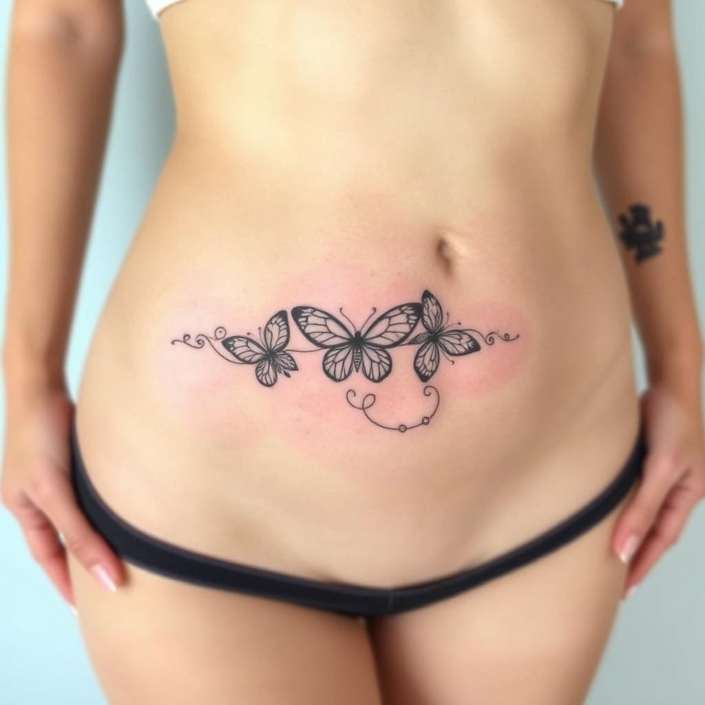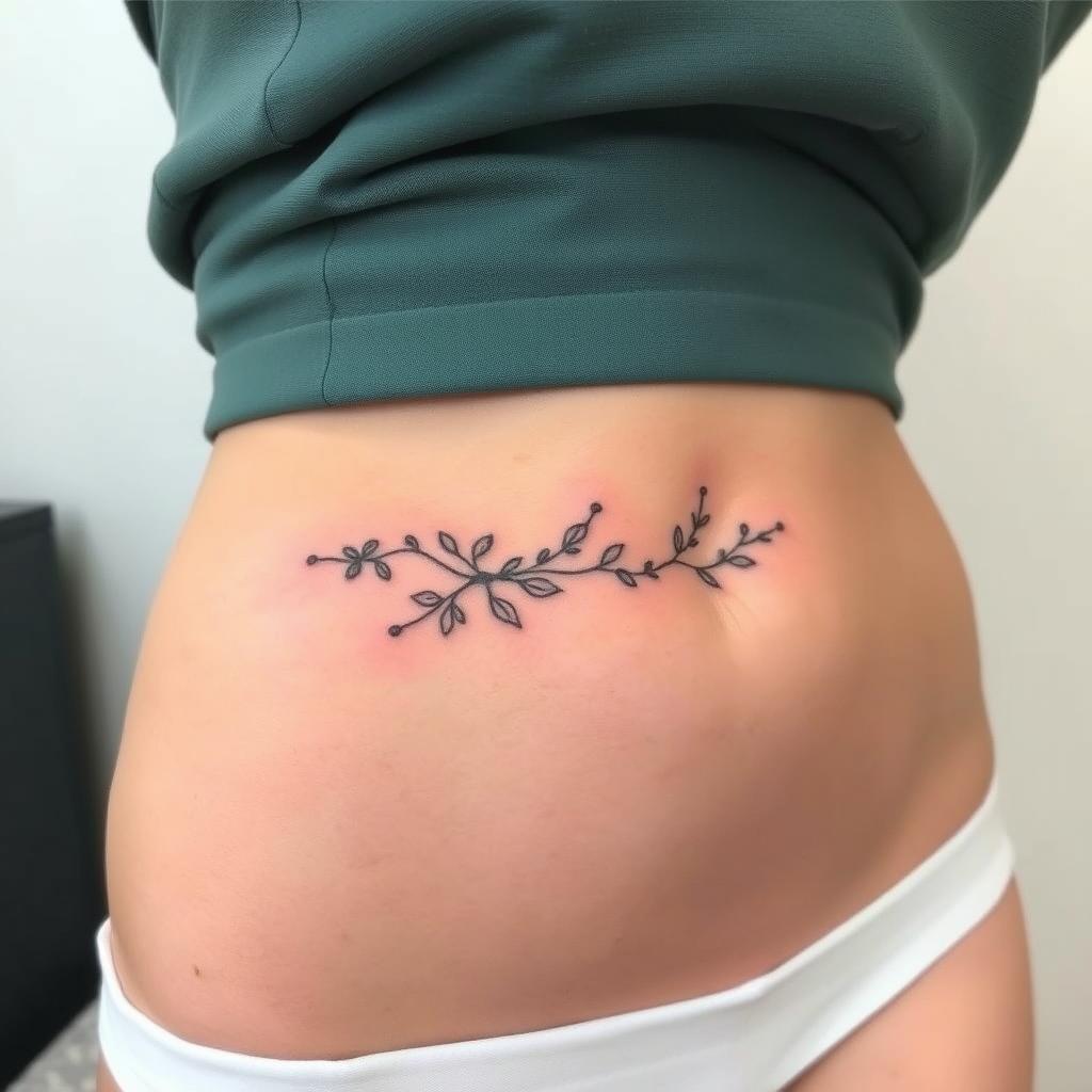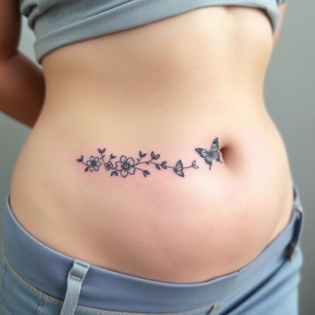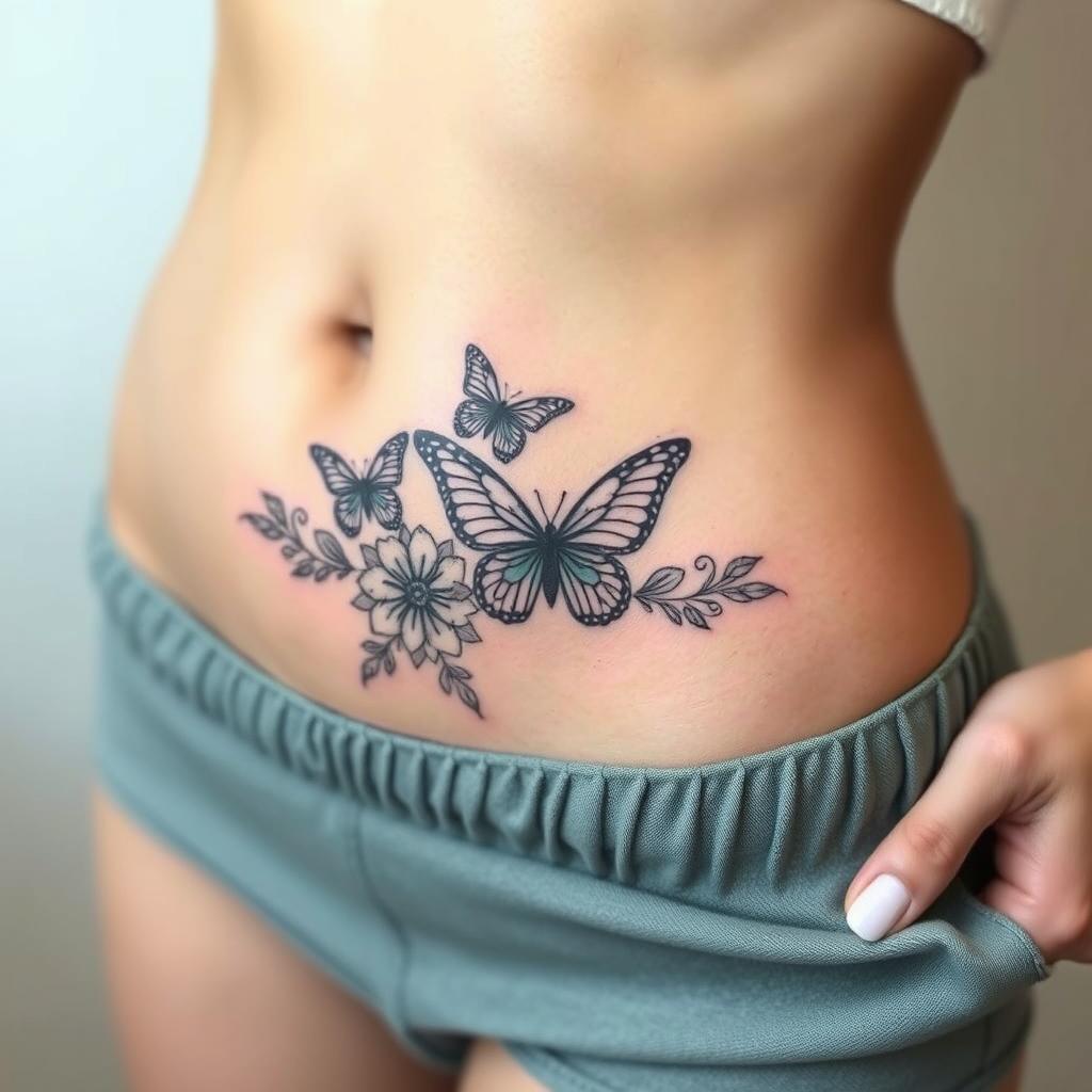 Floral or black-and-white tattoos are popular for lower abdominal scars. Try temporary tattoos to see what you like before getting a permanent one.