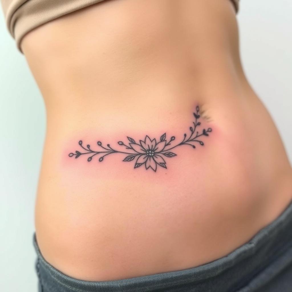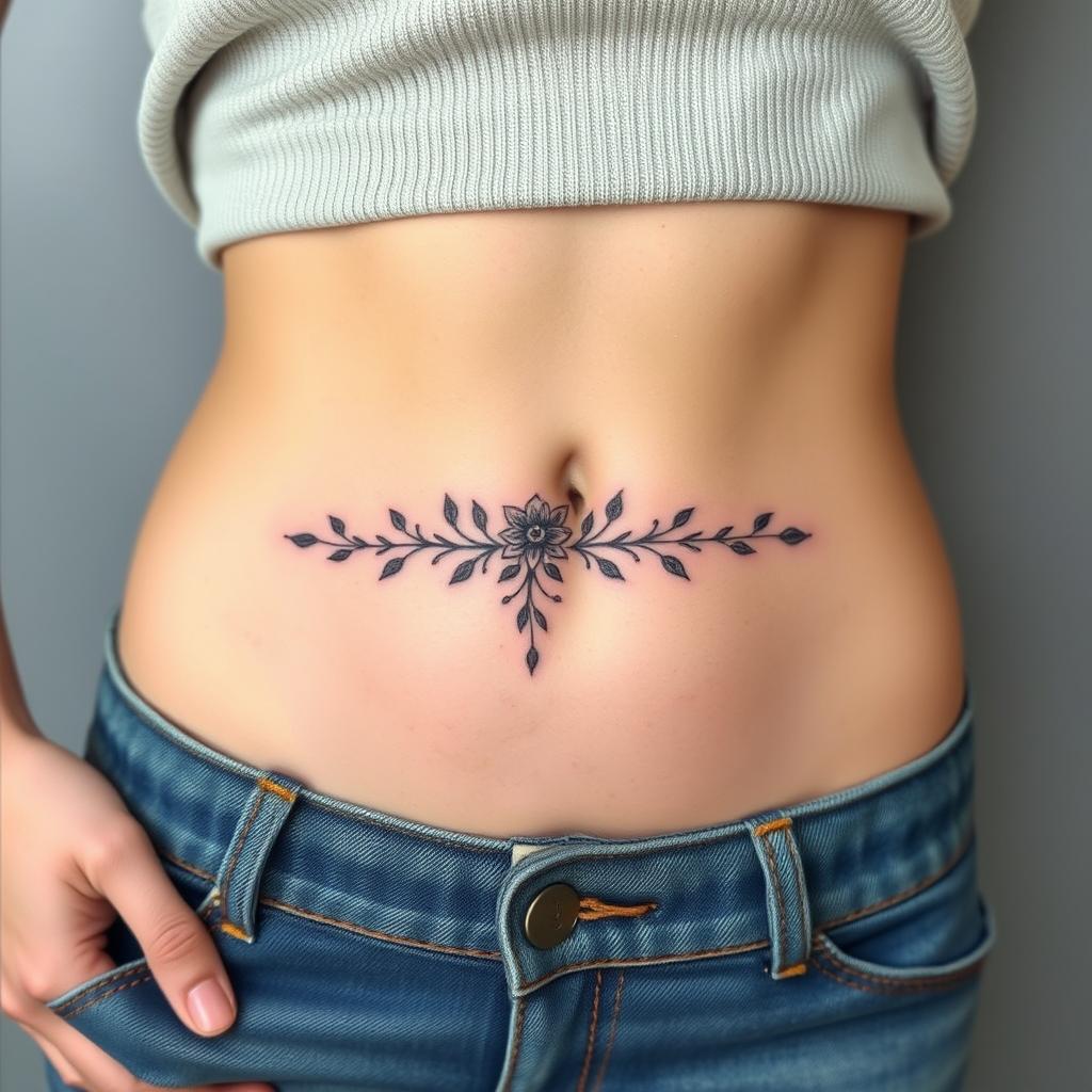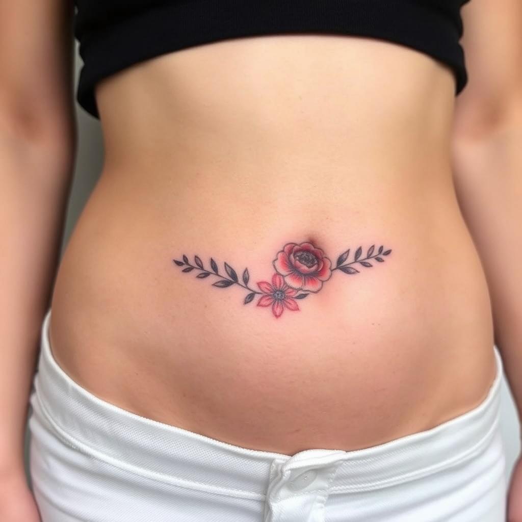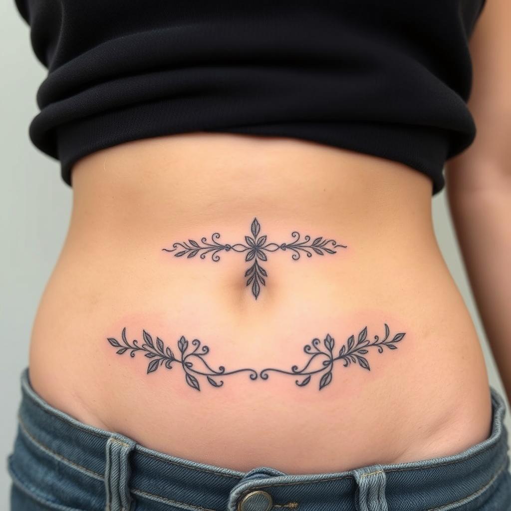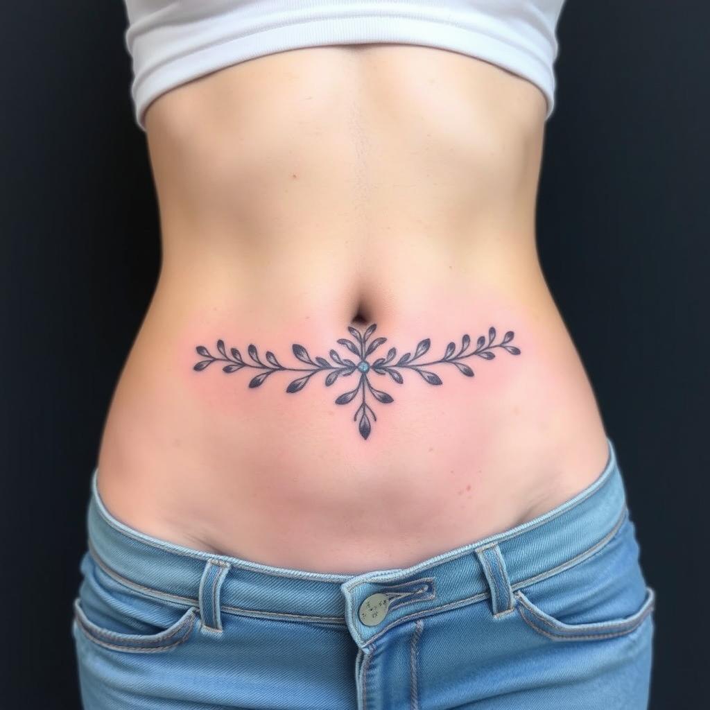 Tummy tuck scars are usually low on the belly. Designs that follow this line, like low-stomach flowers or waistbands, hide the scar well. They also respect your body’s shape.